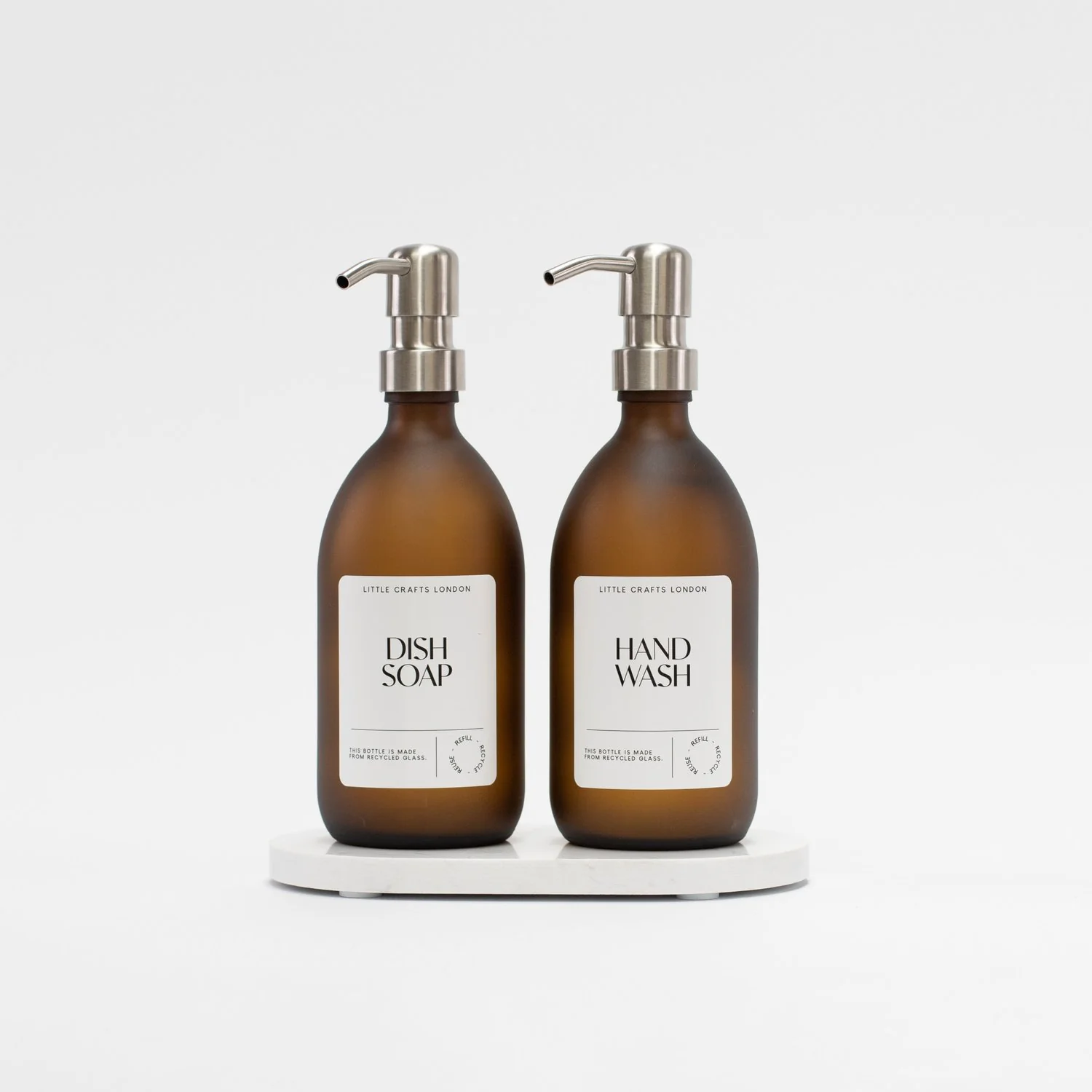 Set of 2 Frosted Amber Glass Bottle 500 ML with Metal Pump & Small Tray White Label