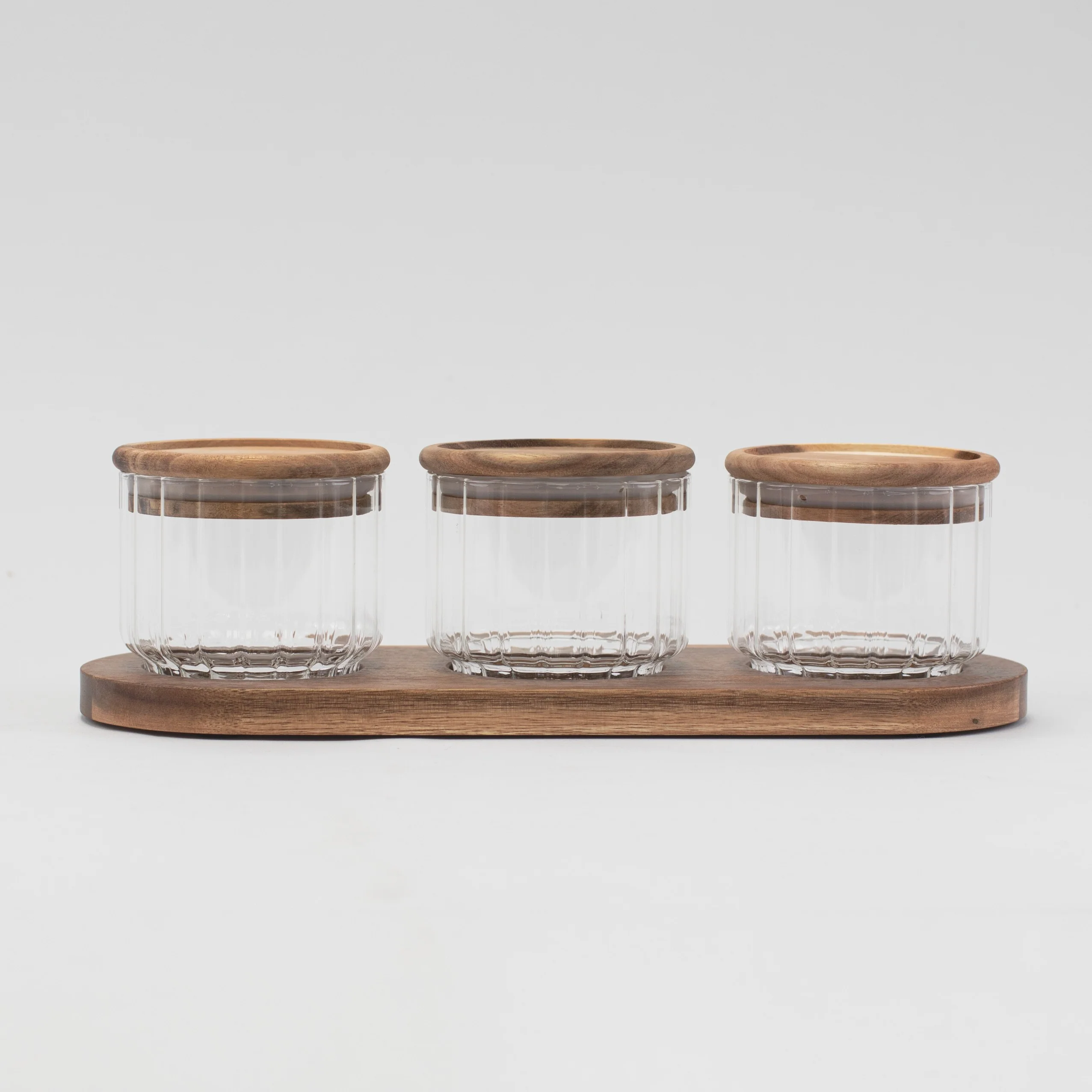 Set Includes: 3 glass jars with wooden lids + 1 wooden tray