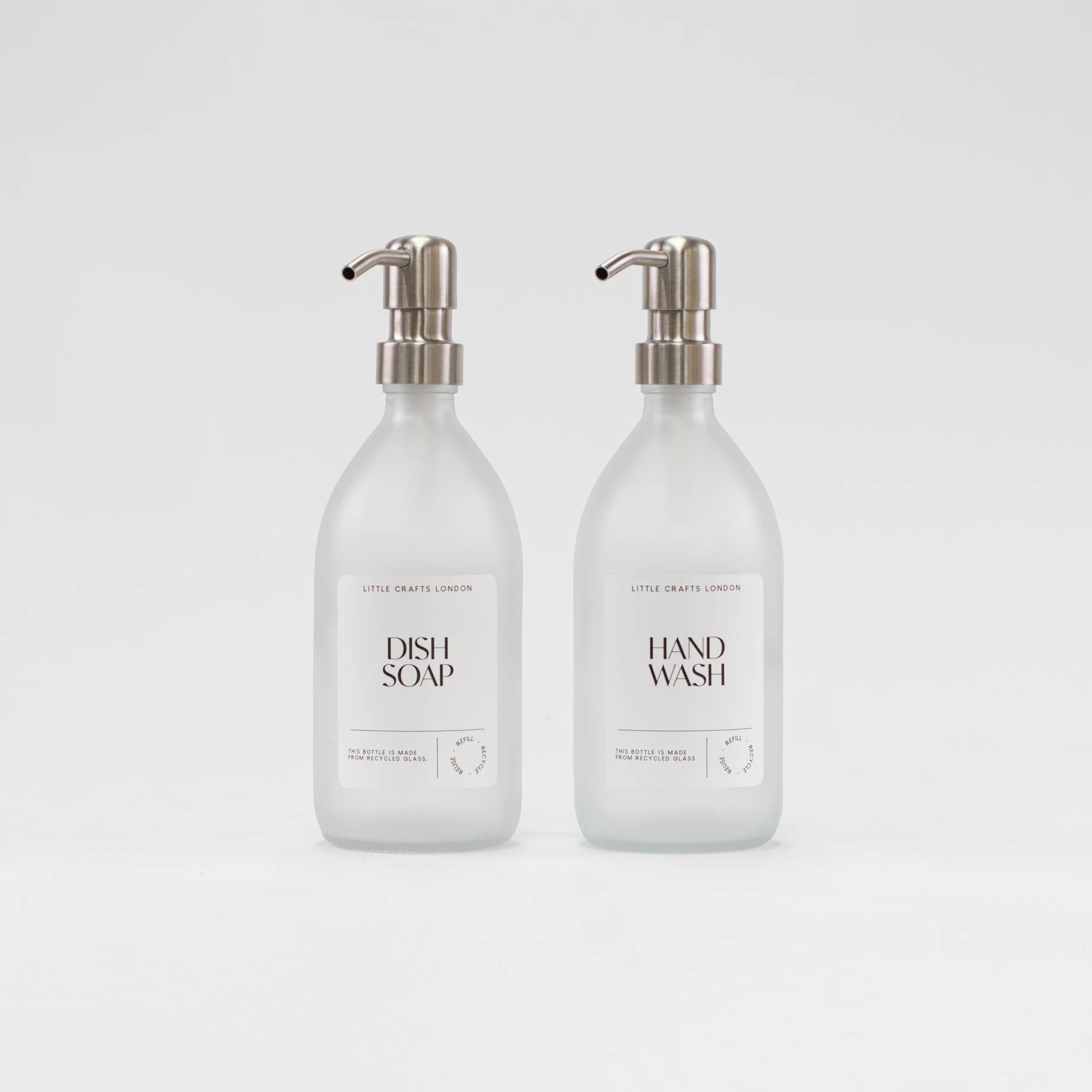 Elevate your everyday essentials with this stylish and sustainable set. Crafted from recycled frosted glass and paired with brushed stainless steel pumps, these reusable bottles are designed to reduce single-use plastic while looking beautiful in your home.