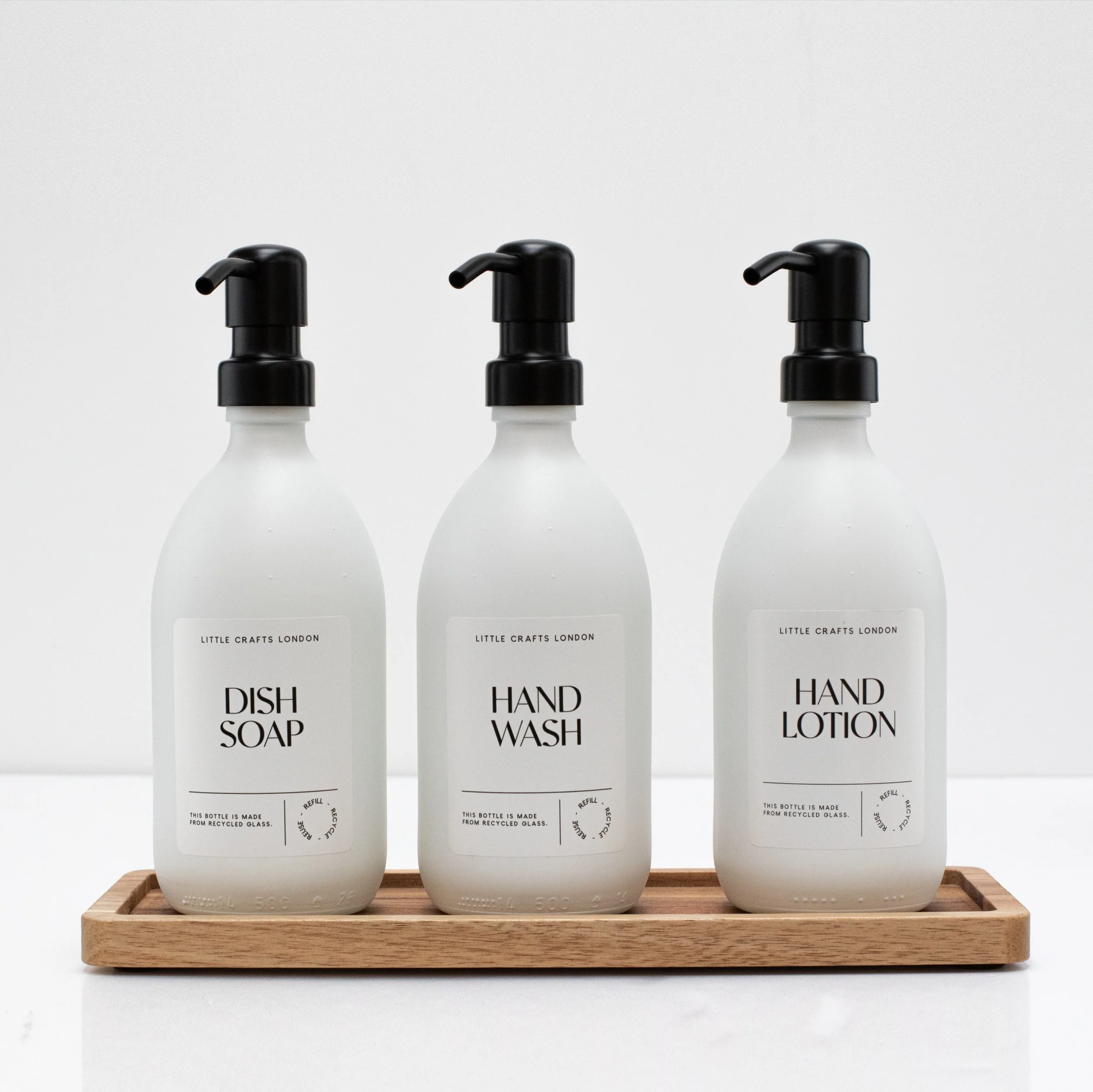 Set of 3 Reusable Milky White Glass Bottles 500 ML with Metal Pump and Long Tray